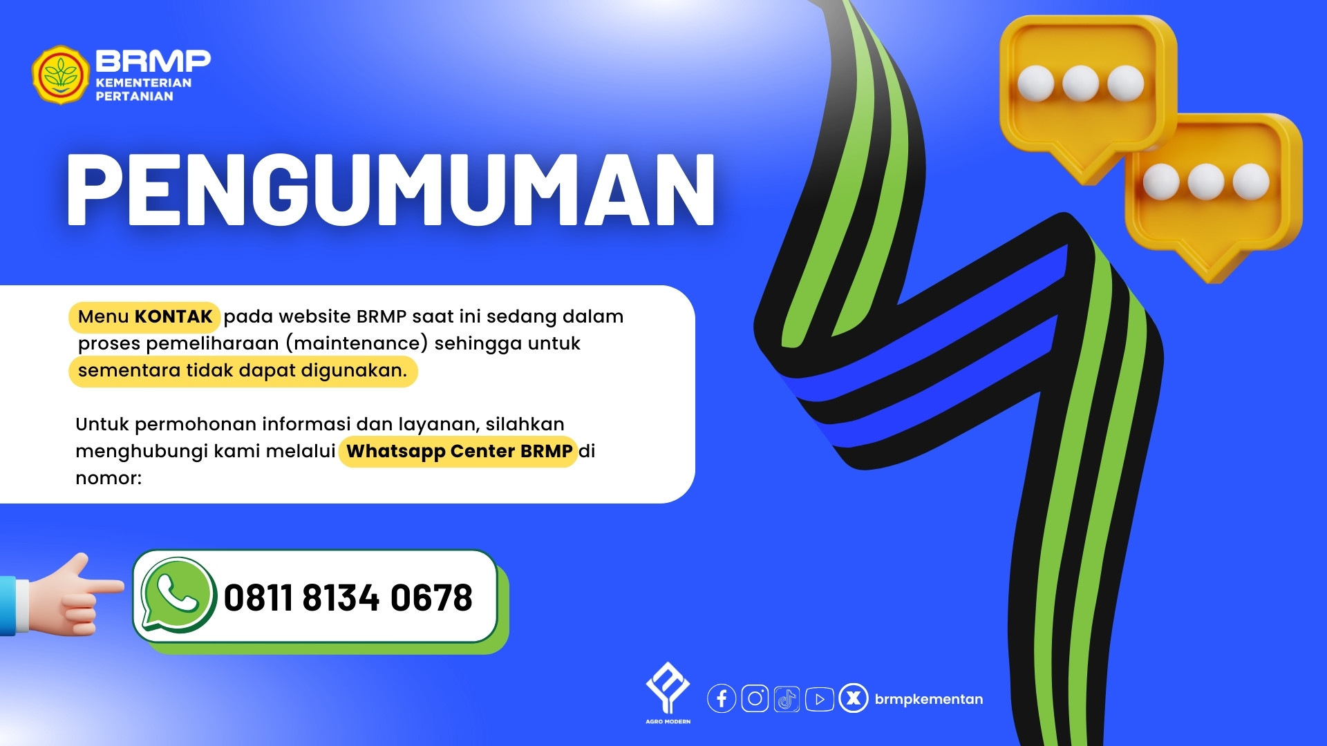Badan Perakitan dan Modernisasi Pertanian menyediakan sarana komunikasi, akses informasi, dan layanan pengetahuan yang terbuka untuk publik. Melalui menu ini, masyarakat, pelaku usaha, peneliti, maupun pemangku kepentingan dapat menyampaikan masukan, memperoleh informasi, dan mengakses sumber daya pengetahuan dengan mudah dan transparan, termasuk menyampaikan pengaduan melalui SP4N LAPOR! maupun Whistleblowing System (WBS). Informasi pengadaan disajikan secara terbuka melalui LPSE dan SIRUP LKPP, sehingga seluruh proses dapat diakses secara terintegrasi, akurat, dan akuntabel.